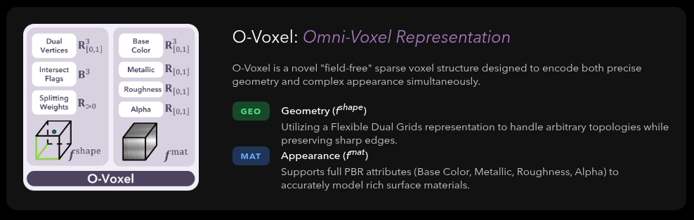 Representación O‑Voxel: una estructura de voxeles de tipo “field‑free” que codifica geometría y apariencia simultáneamente. Soporta superficies abiertas, geometrías no manifold e interiores cerrados.